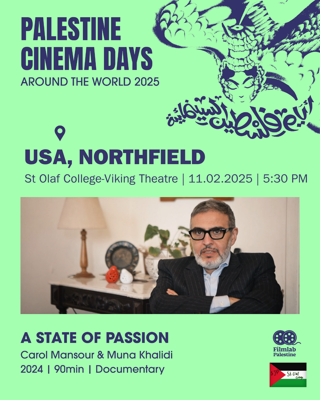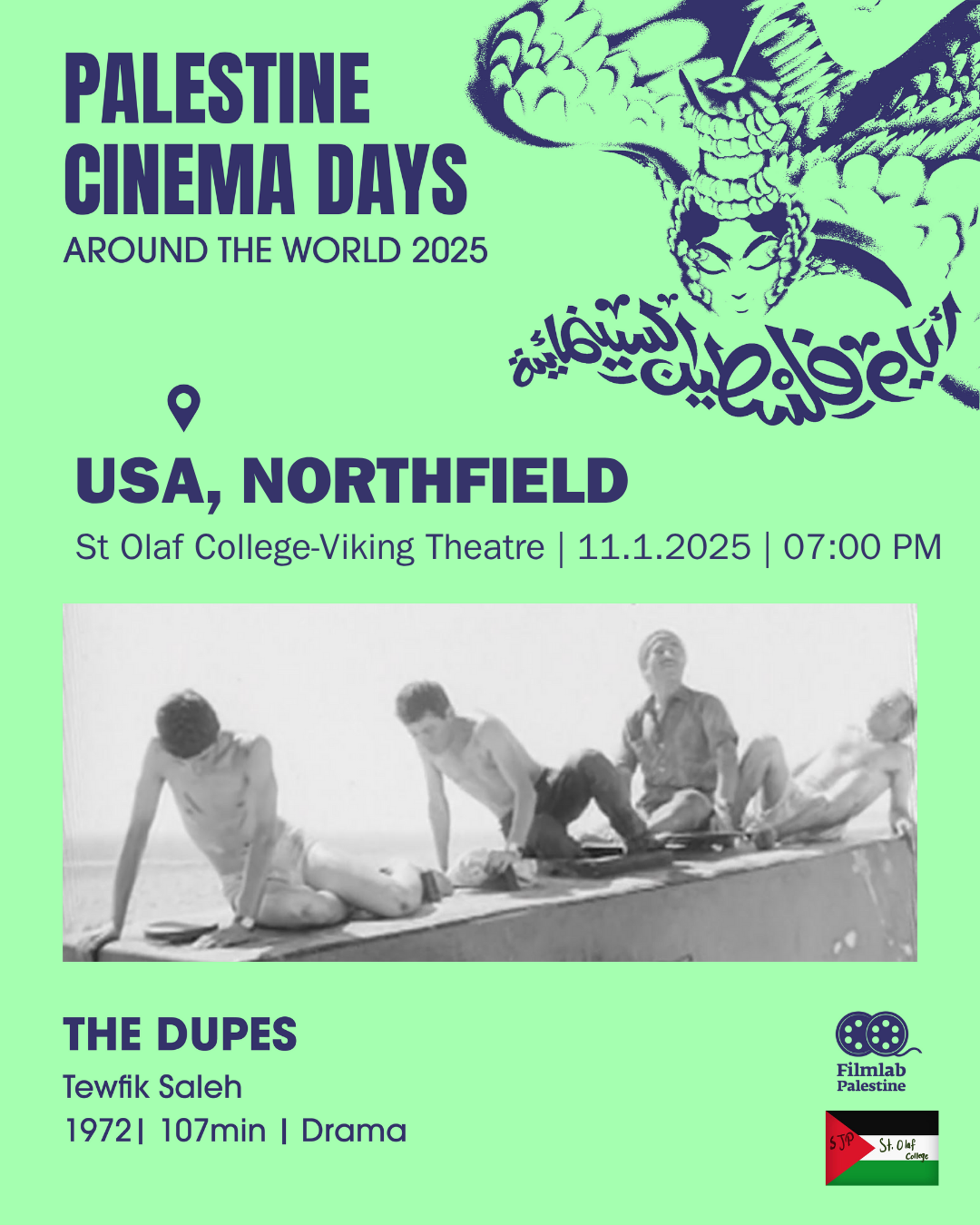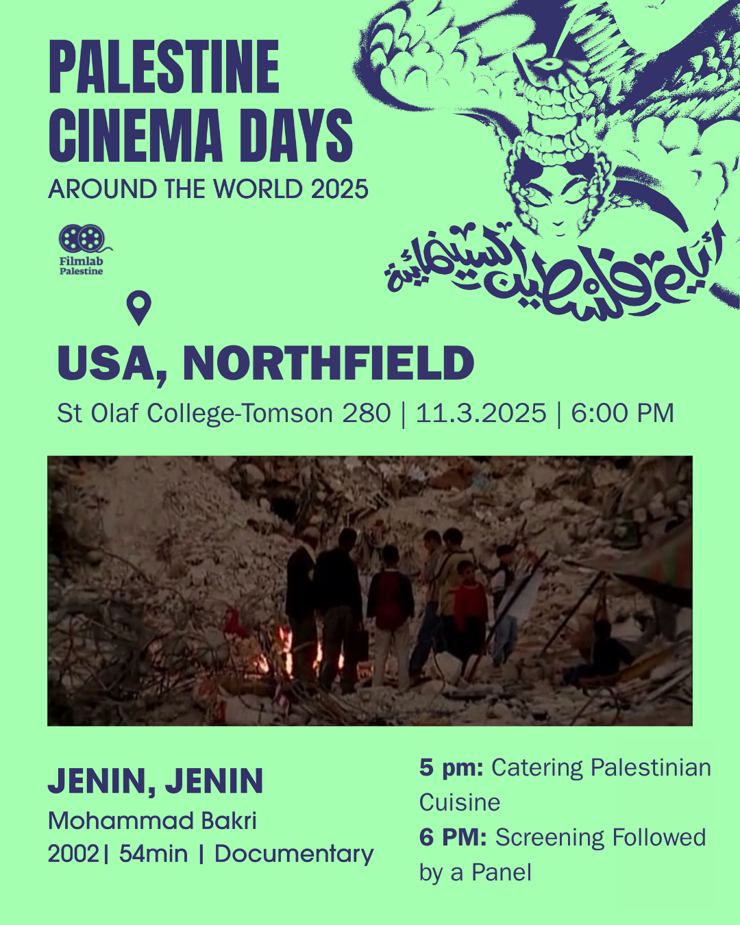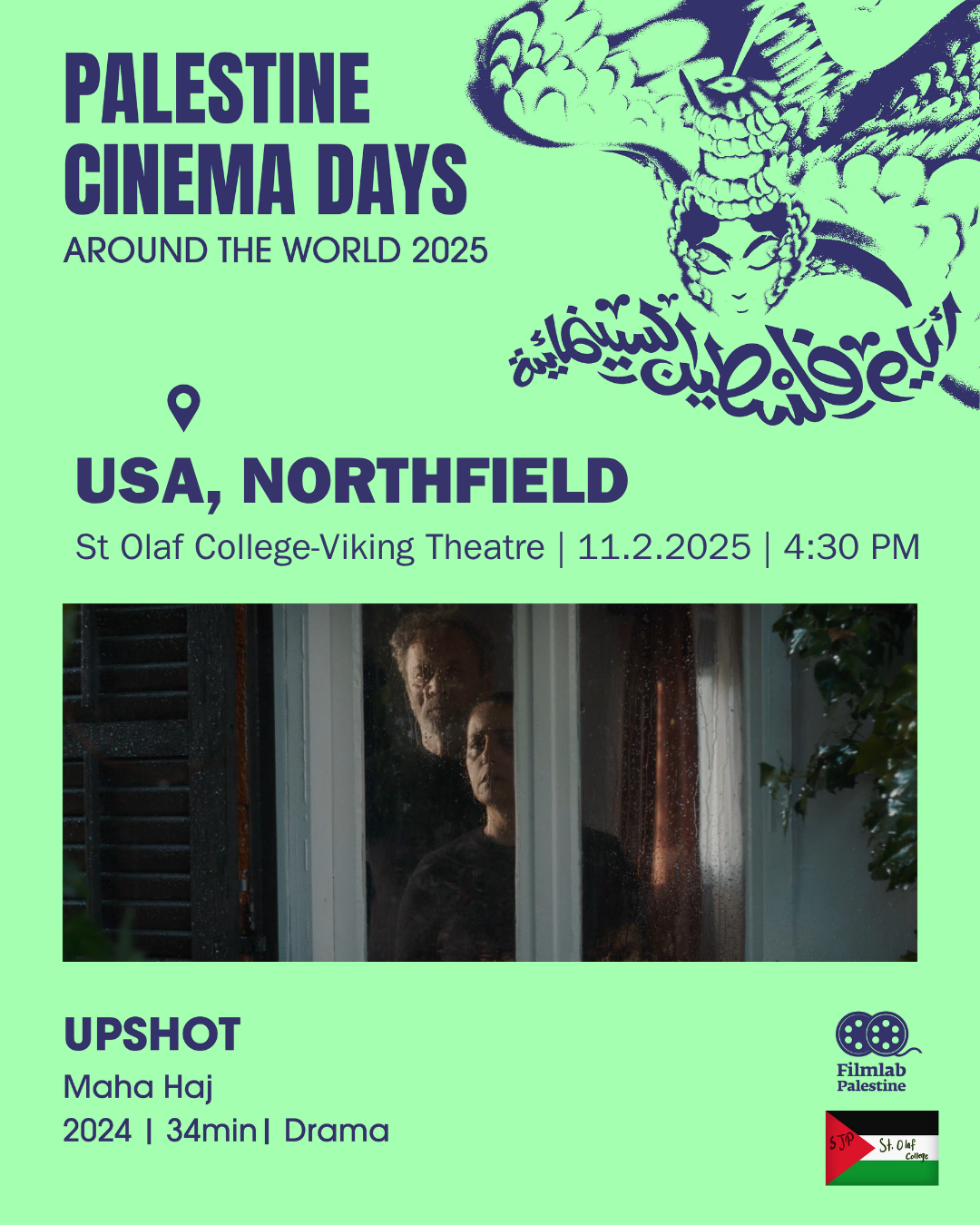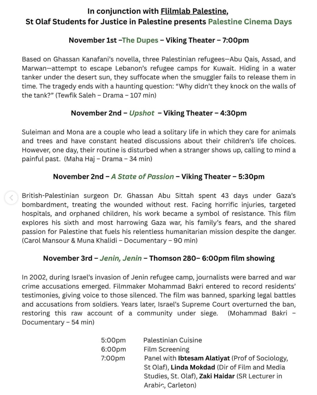 On November 2nd, the anniversary of the Balfour Declaration, Palestine Cinema Days organizes over 500 Palestinian film screenings around the world. This global effort is a show of solidarity with Palestine, an act of amplification for censored Palestinian voices, and a contribution to shifting the distorted narrative. SJP at St. Olaf College is hosting screenings for four films. More information on the posters below!