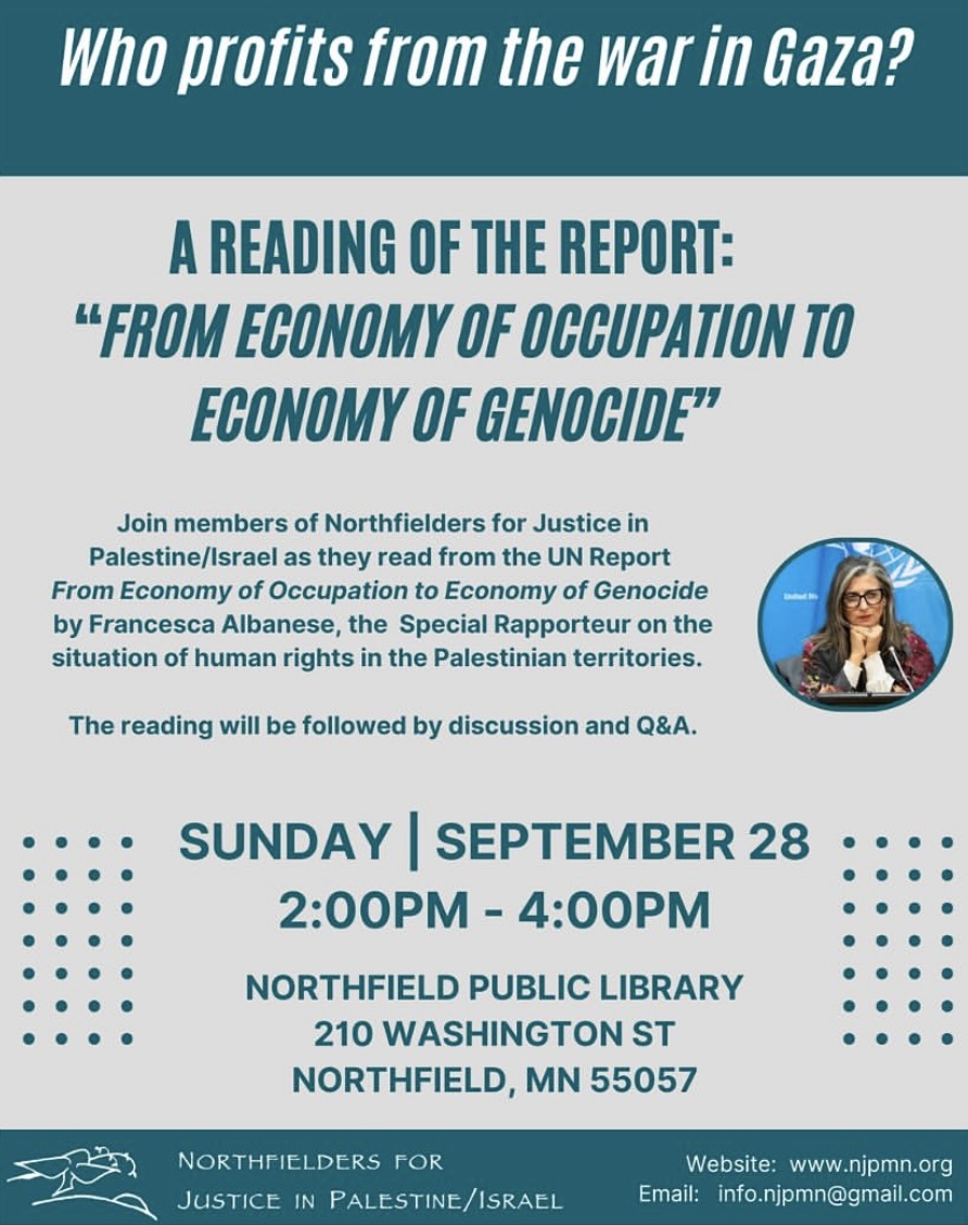 To help answer that question, NJP/I invites you attend a presentation of the UN report by Francesca Albenese, "From Economy of Occupation to Economy of Genocide." on Sunday September 28, 2-4 p.m., in the Northfield Public Library. Francesca Albanese (b. 1977) is an Italian legal scholar and expert on human rights. In May 2022 she was appointed the United Nations Special Rapporteur on the Occupied Palestinian Territories.