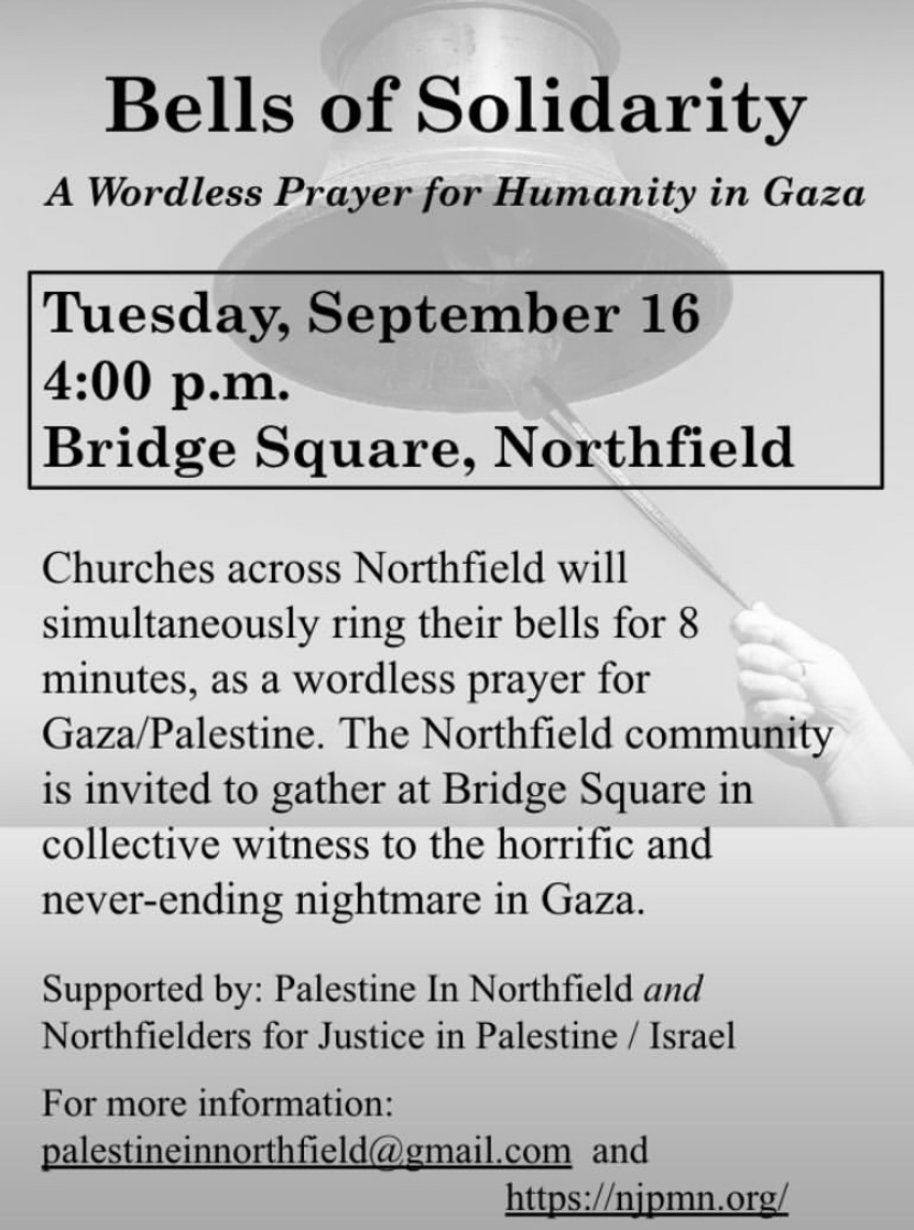 Churches in Northfield will simultaneously ring bells on September 16th as a Wordless Prayer for Humanity in Gaza. Organized by citizens of Northfield and supported by Palestine in Northfield and Northfielders for Justice in Palestine/Israel, we invite you to a collective listening of the ringing bells at 4:00 PM at Bridge Square, Northfield. Following a welcome, attendees will be invited to stand together in silence as church bells ring at 4:21 p.m.