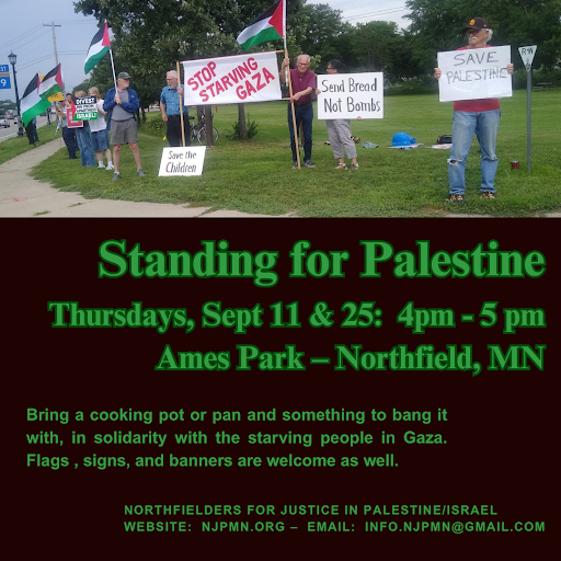 To feel that we are "doing something" helps us to cope with the dire situation in Gaza. Join Northfielders as they gather at Ames Park to STAND IN SOLIDARITY with the people of Palestine - especially the starving people in Gaza. Flags, signs, and banners are welcome.